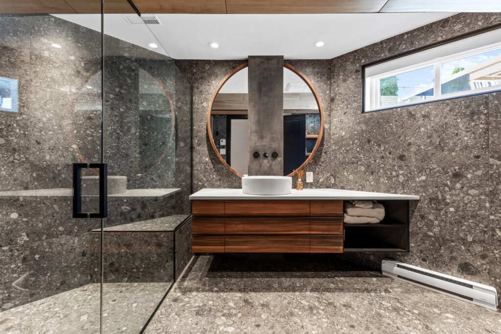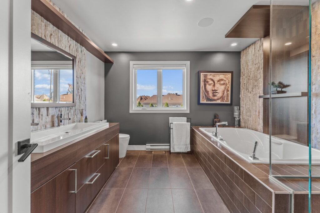 La propriété offre trois salles de bain complètes et une salle d’eau, toutes entièrement rénovées avec des finis modernes et de qualité.
