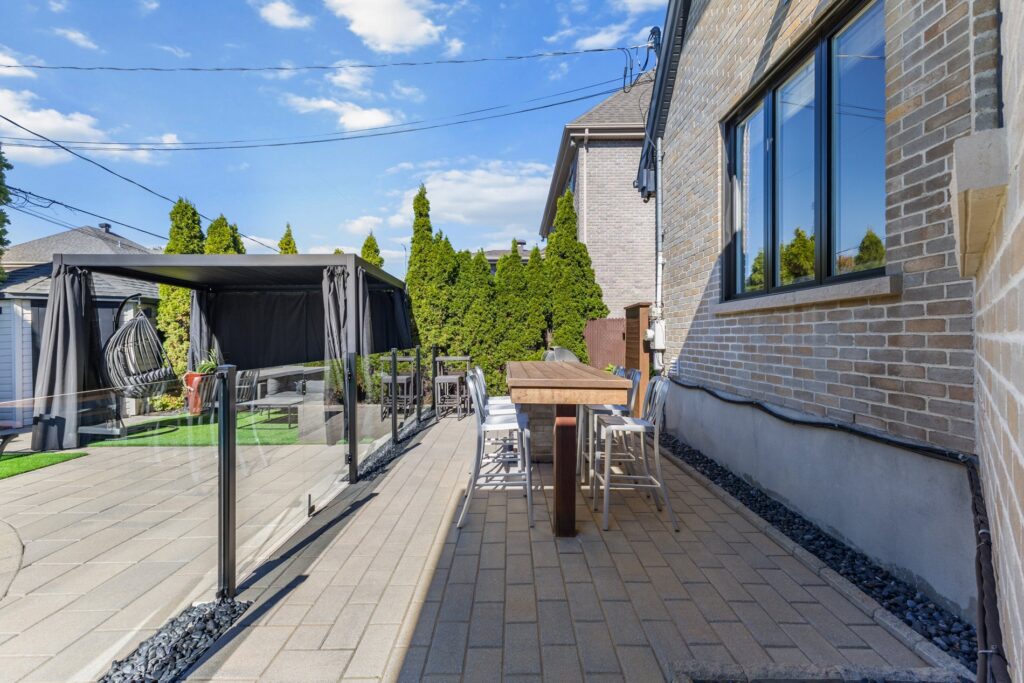La cour est magnifiquement aménagée avec du pavé uni de l’avant à l’arrière, assurant un entretien minimal et un style remarquable.