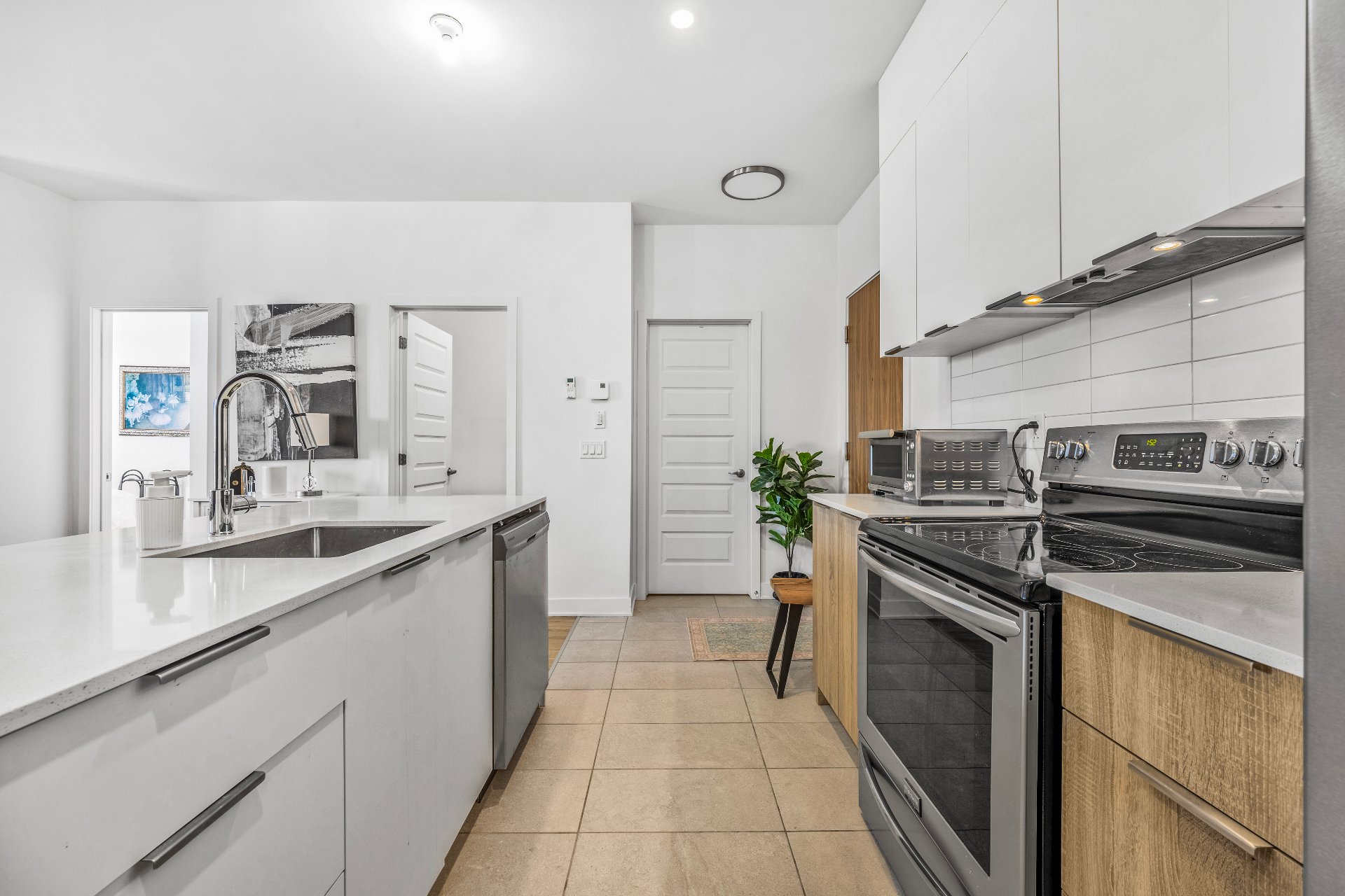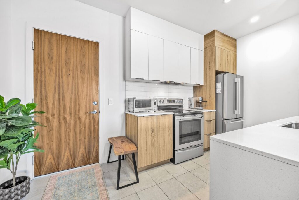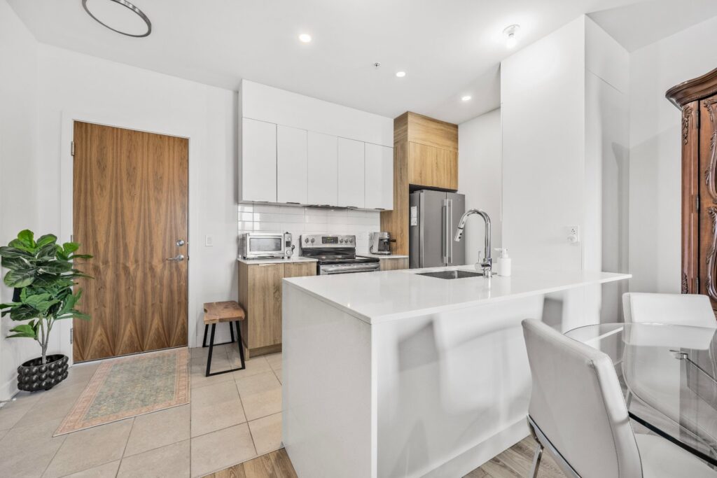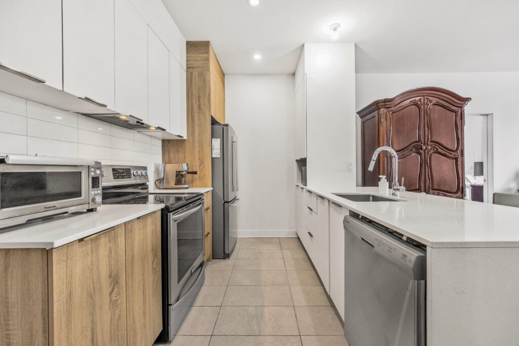 La cuisine, pensée pour allier esthétique et performance, propose un vaste îlot central, des surfaces en quartz et des électroménagers en acier inoxydable.