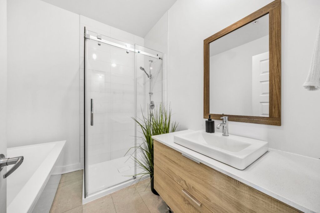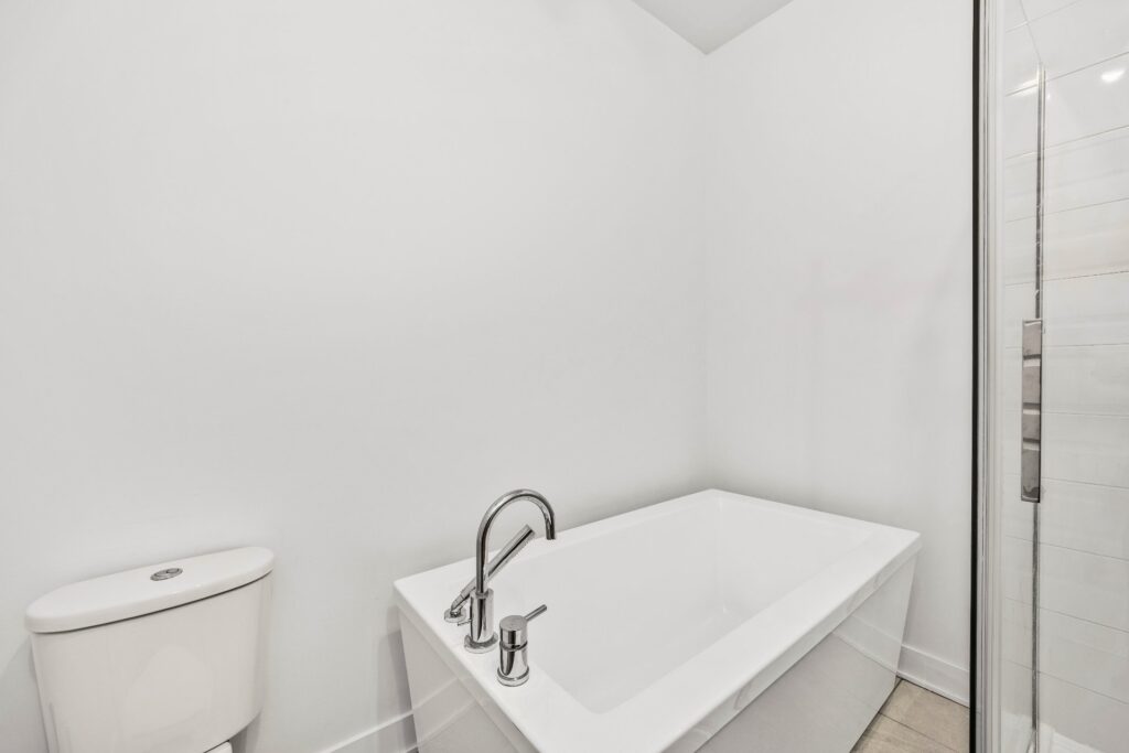 Les deux chambres assurent confort et intimité, tandis que la salle de bain combine élégance et fonctionnalité avec sa douche vitrée indépendante et sa baignoire moderne.