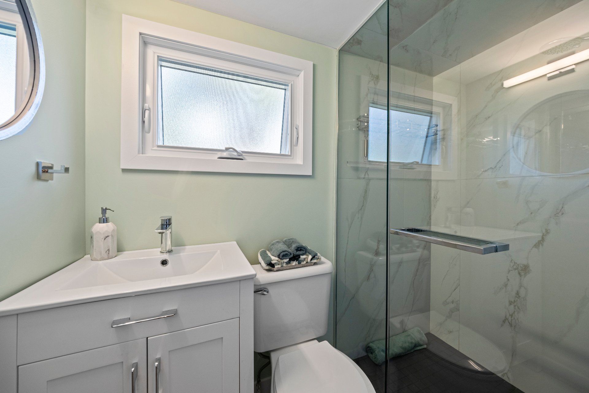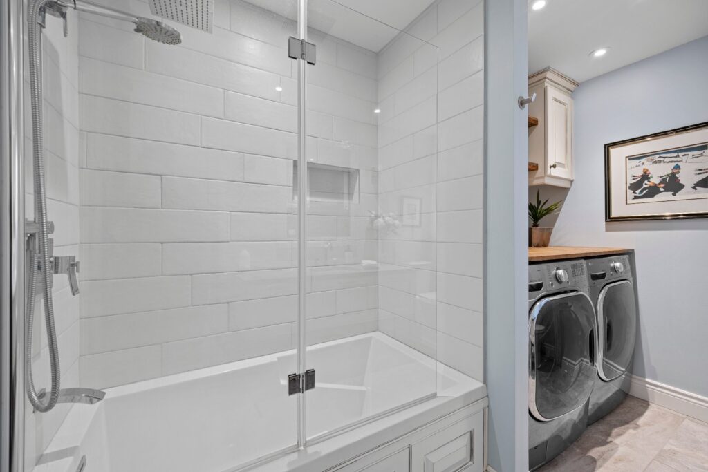 La salle de bain comprend une combinaison bain-douche ainsi que des étagères en bois naturel au-dessus de la buanderie intégrée, ce qui rend l’entretien domestique à la fois pratique et discret.