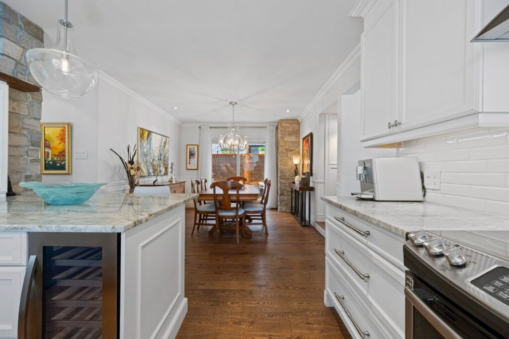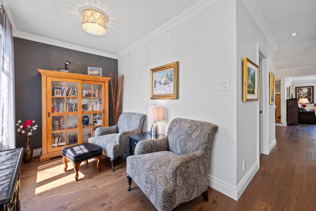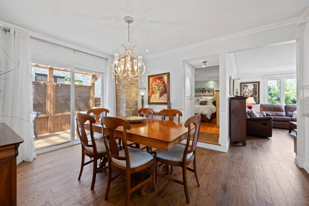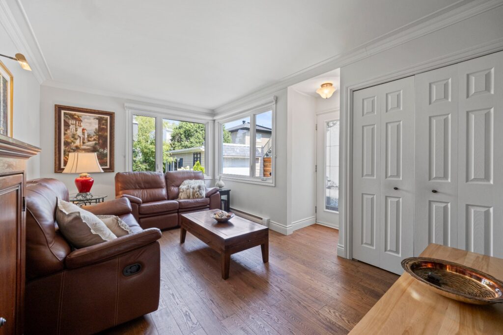 Le salon adjacent est chaleureux, lumineux grâce aux fenêtres modernes et s’ouvre naturellement sur une salle à manger élégante, parfaite pour les soupers entre amis ou les repas familiaux.
