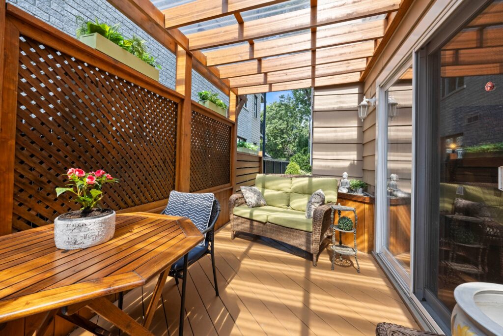 Aménagée dans un style contemporain, elle dispose d’une pergola en bois, d’un mobilier confortable et de plantes verdoyantes.