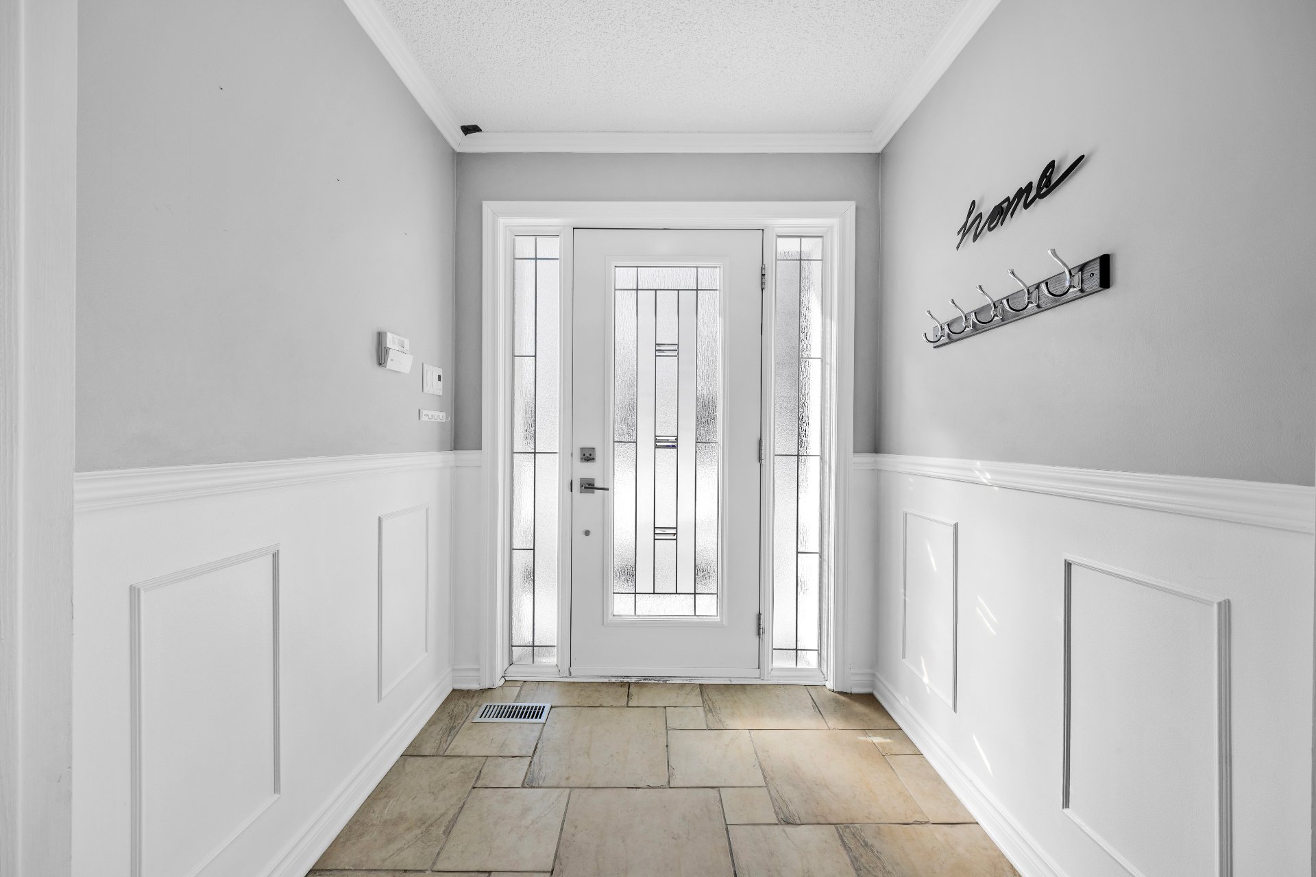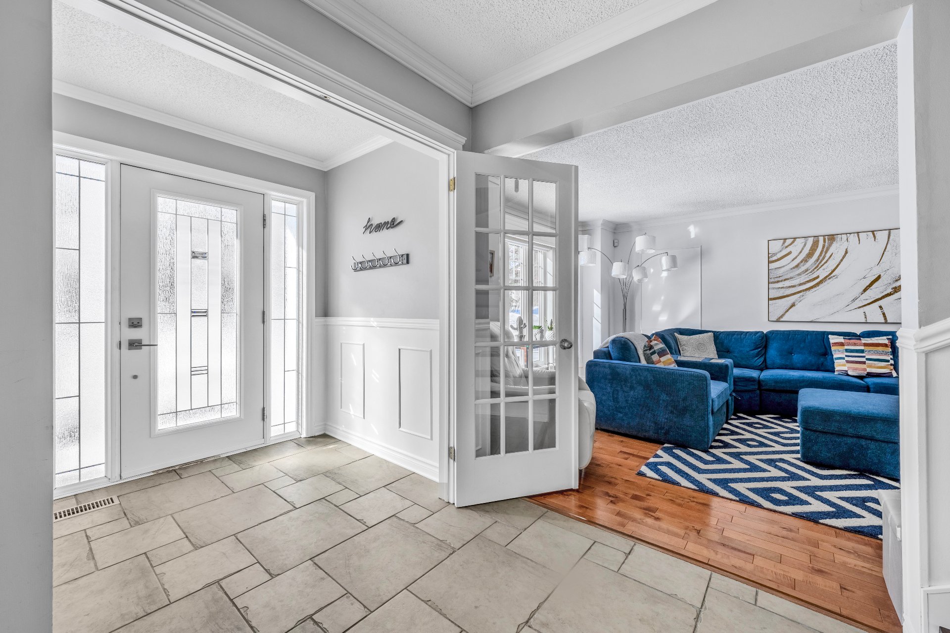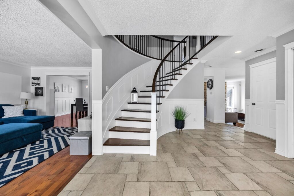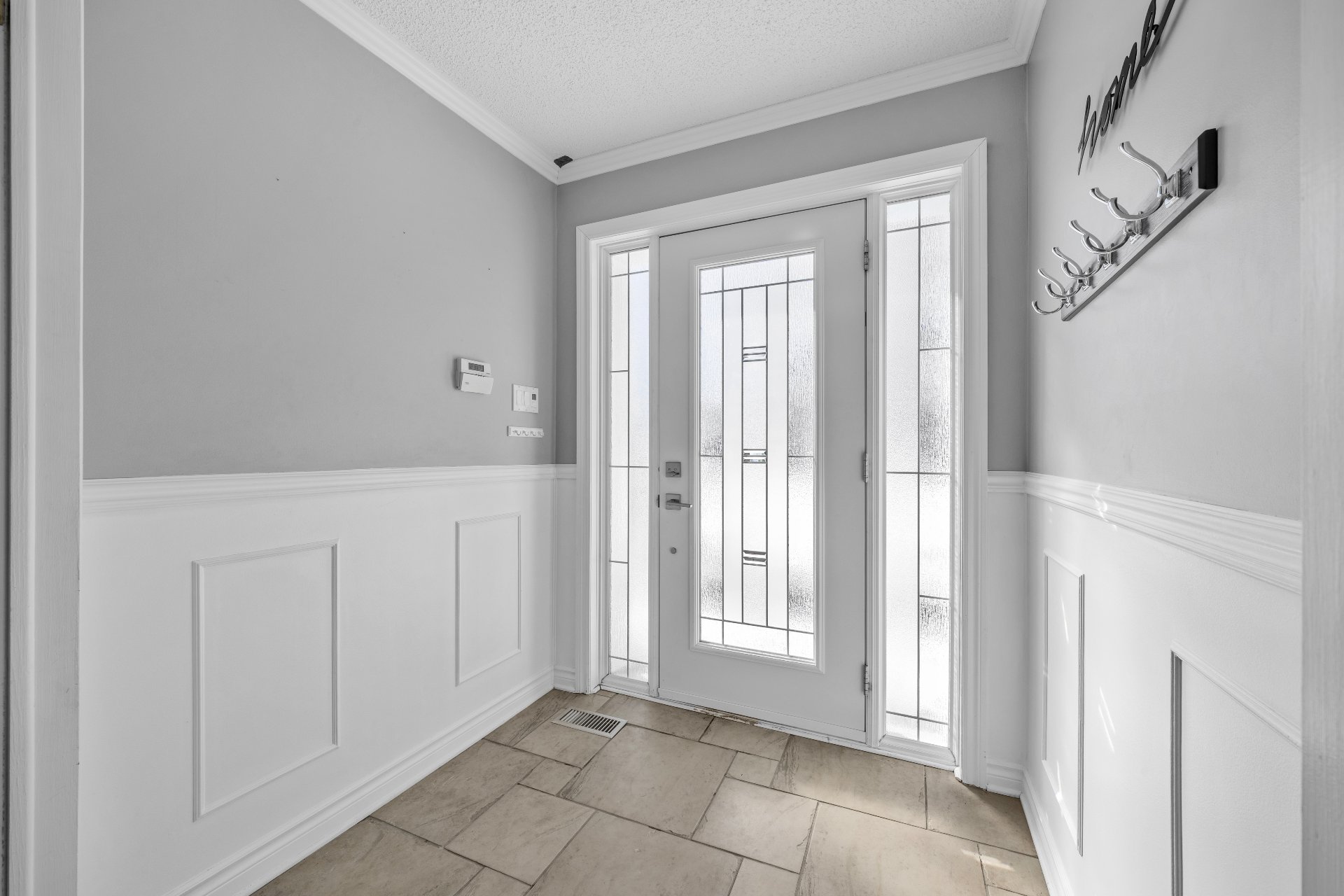 Le hall spacieux distribue harmonieusement le salon, le garage et l’accès au sous-sol.