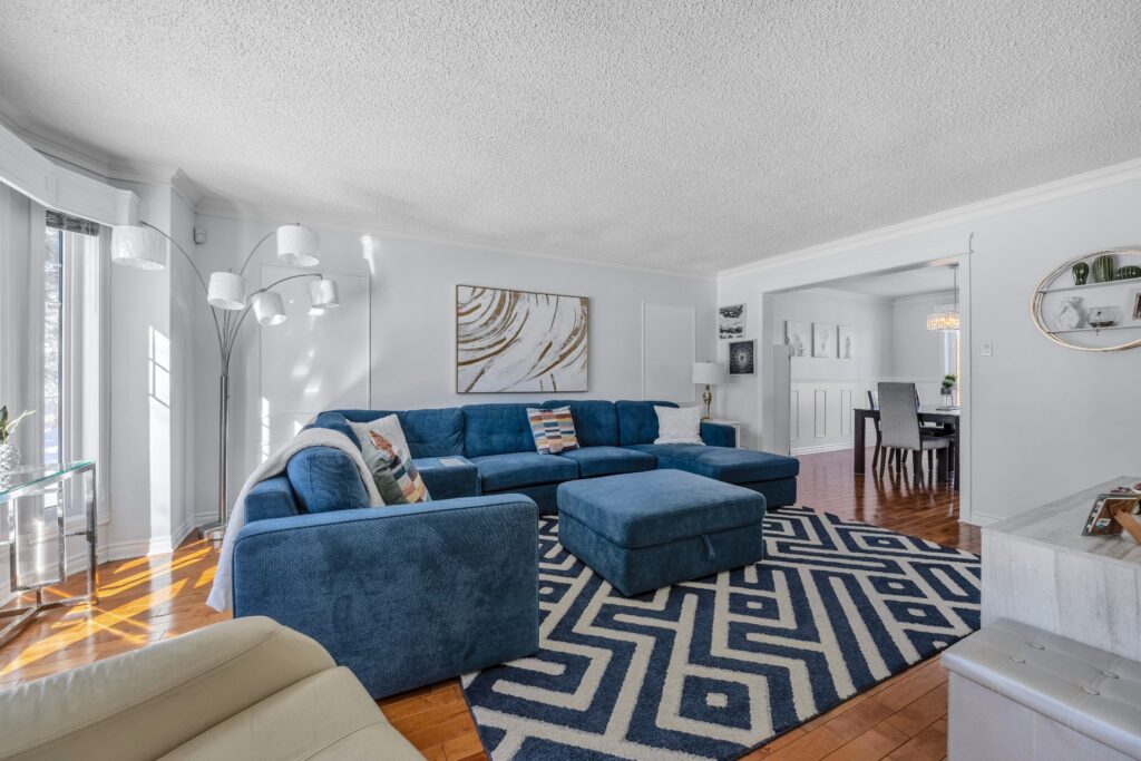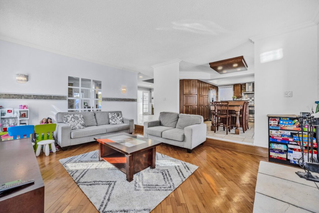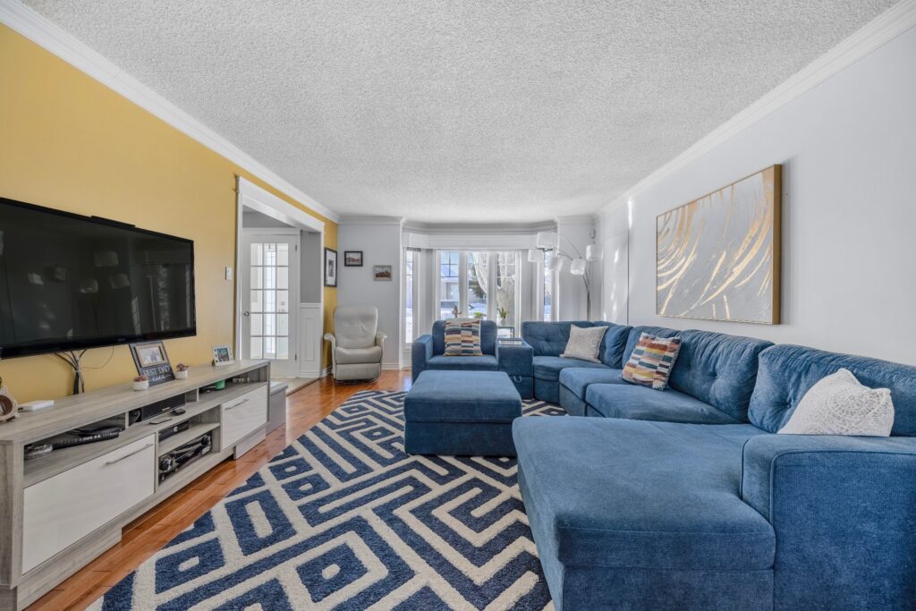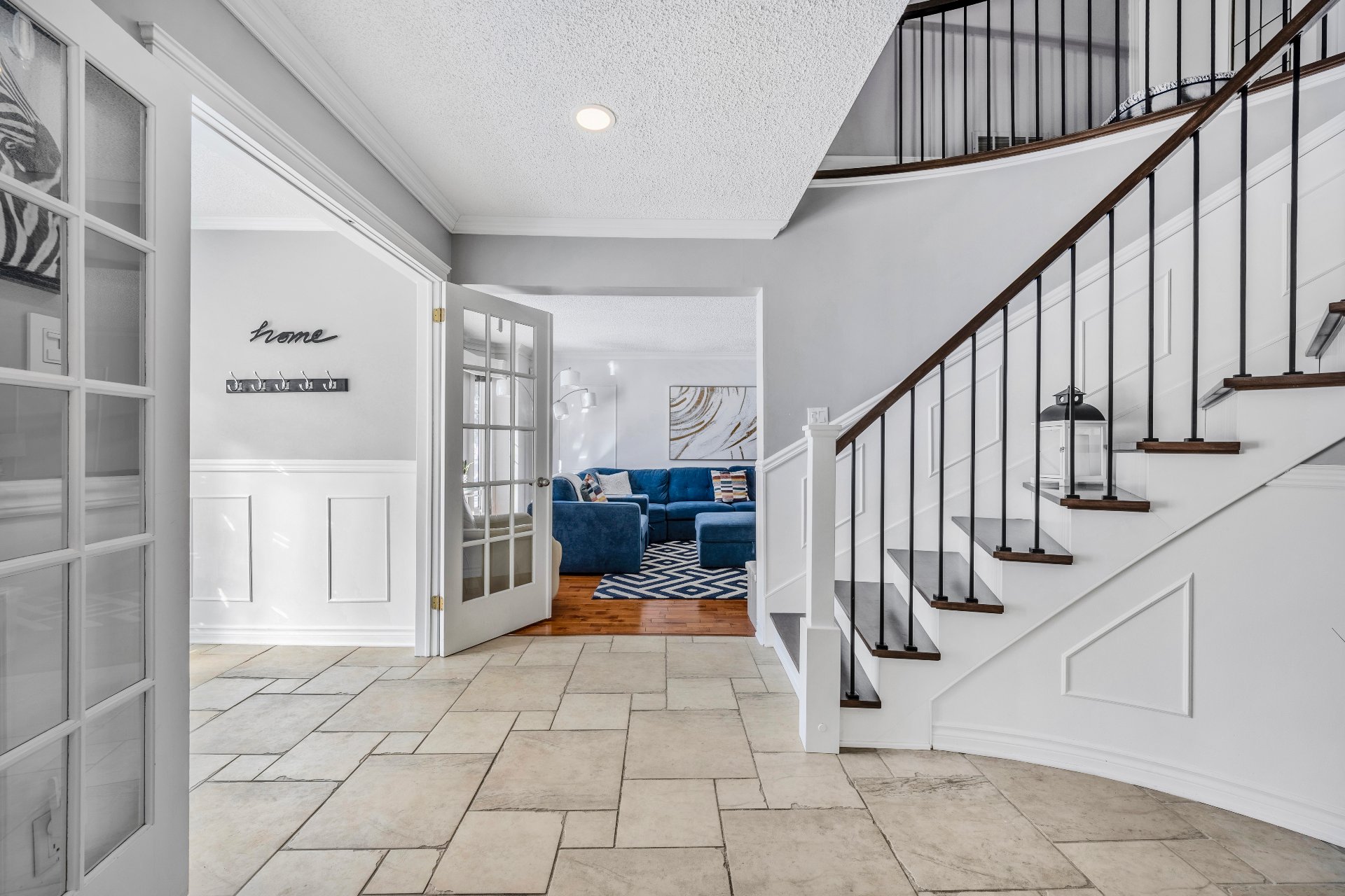 Le hall spacieux distribue harmonieusement le salon, le garage et l’accès au sous-sol.