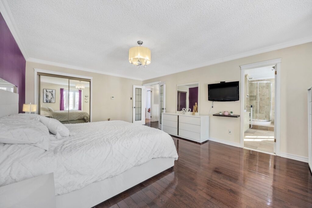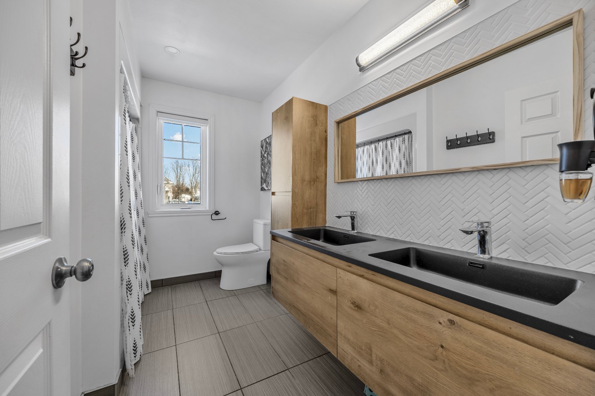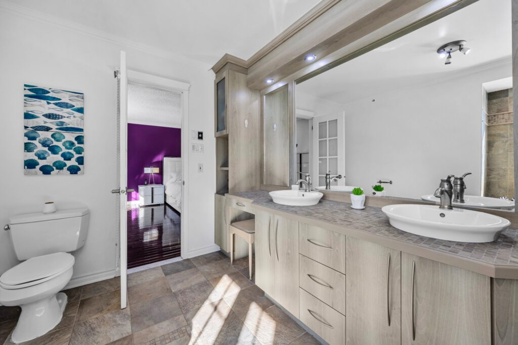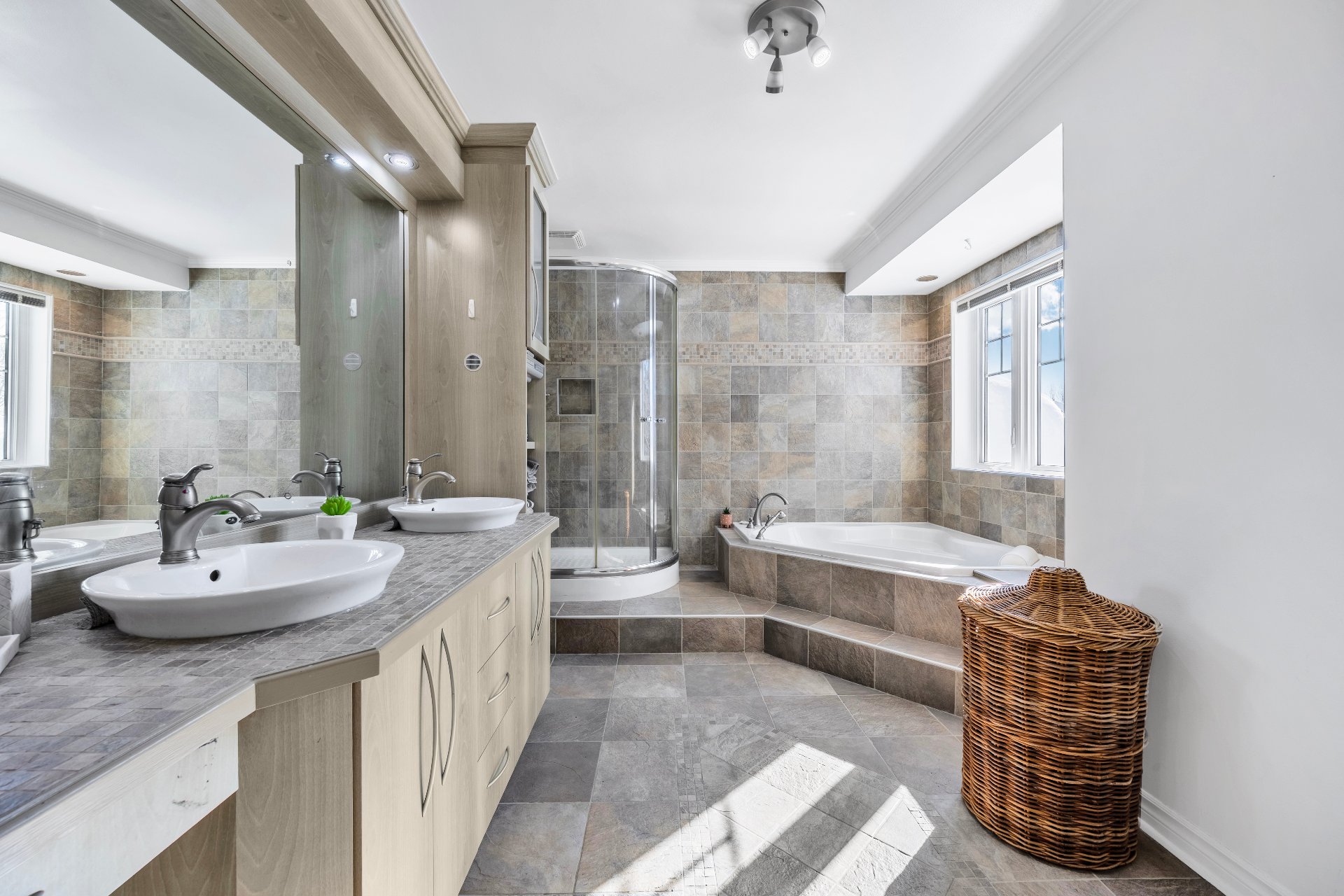 À l’étage, la suite principale se distingue par son immense walk-in et sa salle de bain privée munie d’une douche vitrée indépendante.